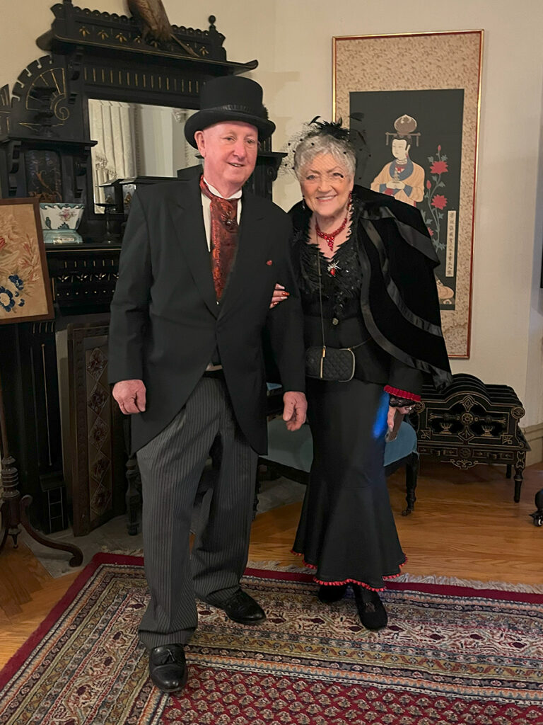 Then, after 15 minutes, we were ushered to the front of the house. Guests were welcomed into the foyer to take photos at two spots set up as photo ops. (Cathy and JR were just too adorable not to snag a pic of!) Once everyone had settled in, we gathered around to watch a video. It reviewed what to expect for our haunted high tea at Winchester and then we met our hostess, Diana.