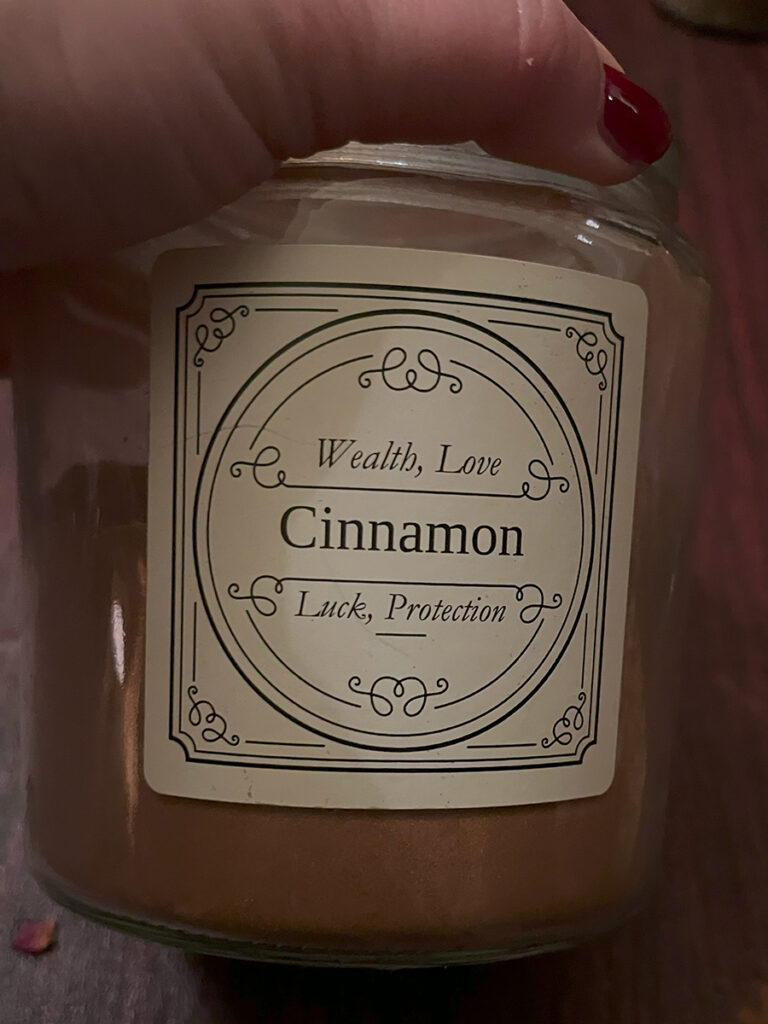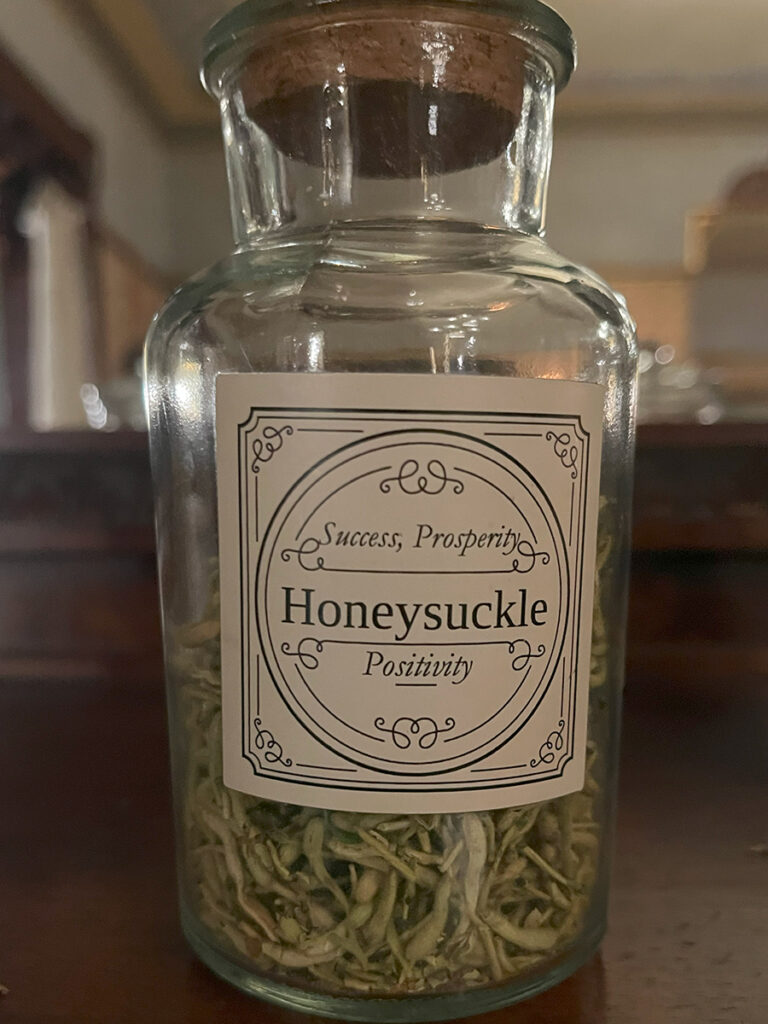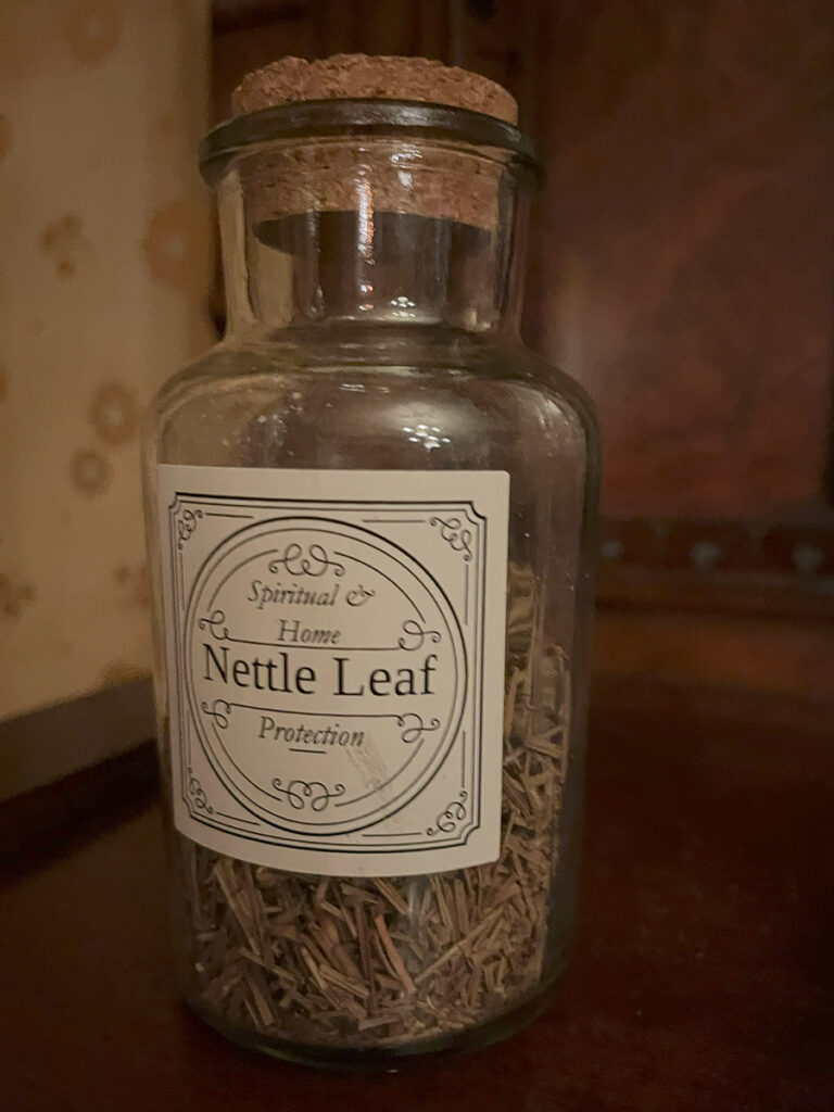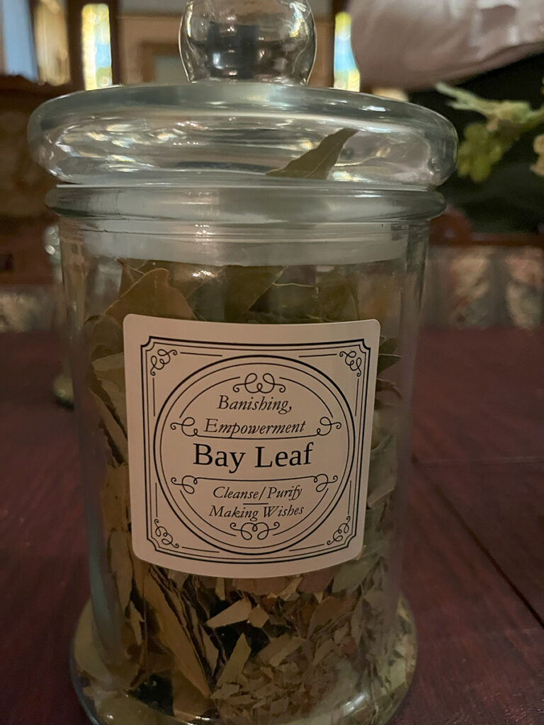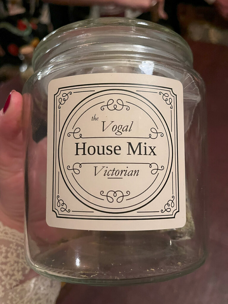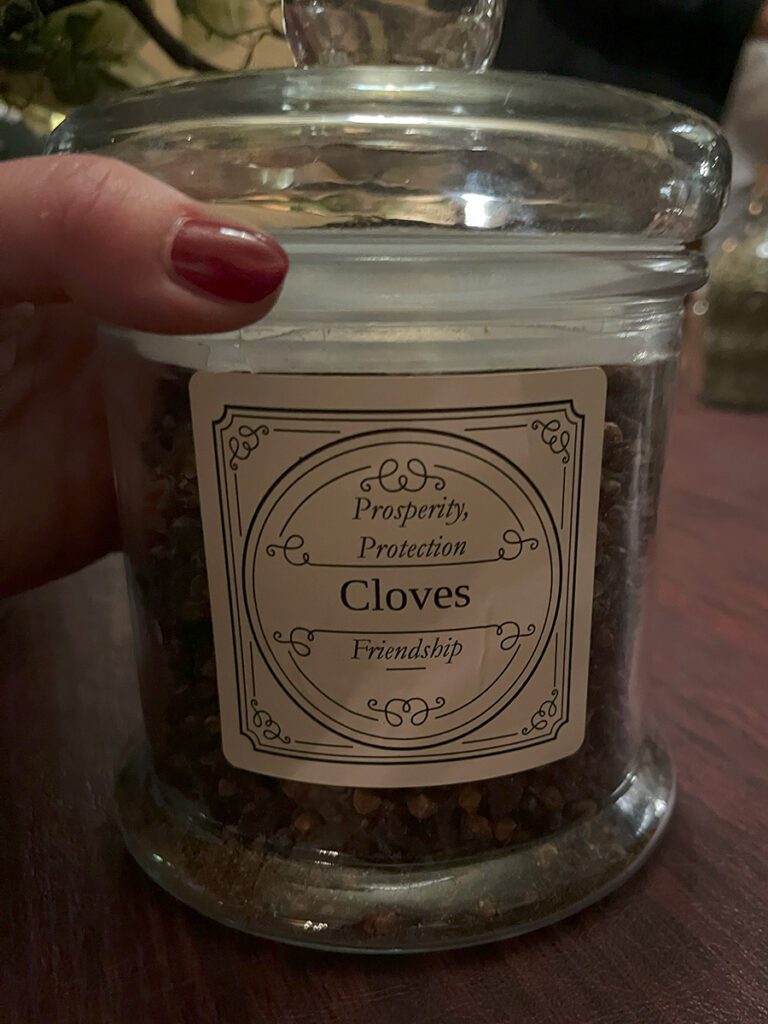 Following introductions, we were then directed to the twin dining rooms from the parlor. Two stations had been set up between each room with assorted apothecary jars. Each was filled with assorted herbs and their meanings. Diana then presented a wonderful demonstration for how the building of our charm should go. We were handed a small vial to fill and encouraged to get to it. We were told to shout out across the rooms for jars or intentions we needed. I found that bit particularly enjoyable. I felt the only thing lacking from this activity was a little checklist to mark all the herbs used. Another guest had the brilliant idea of taking photos of each herb and I followed suit.