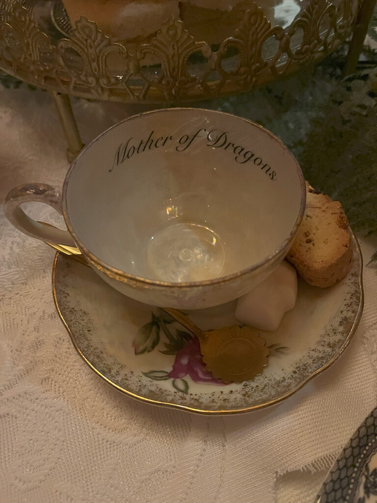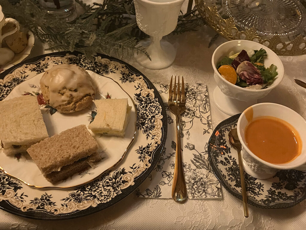 With the “haunted” portion finished, it was at last time for our Winchester high tea! Everyone was seated with a “snarky” tea cup. Later, we read our individual cups out loud to the group. At this point, we were served a tomato bisque in a cup. At this point, Erick leaned over to me and remarked how, “we should always serve soup this way”. Our attention was brought to the tiered trays loaded with tea sandwiches and sweets. Although, I would say the scone was the star of the whole array. I would like to emphasize that everything was beyond delightful.
